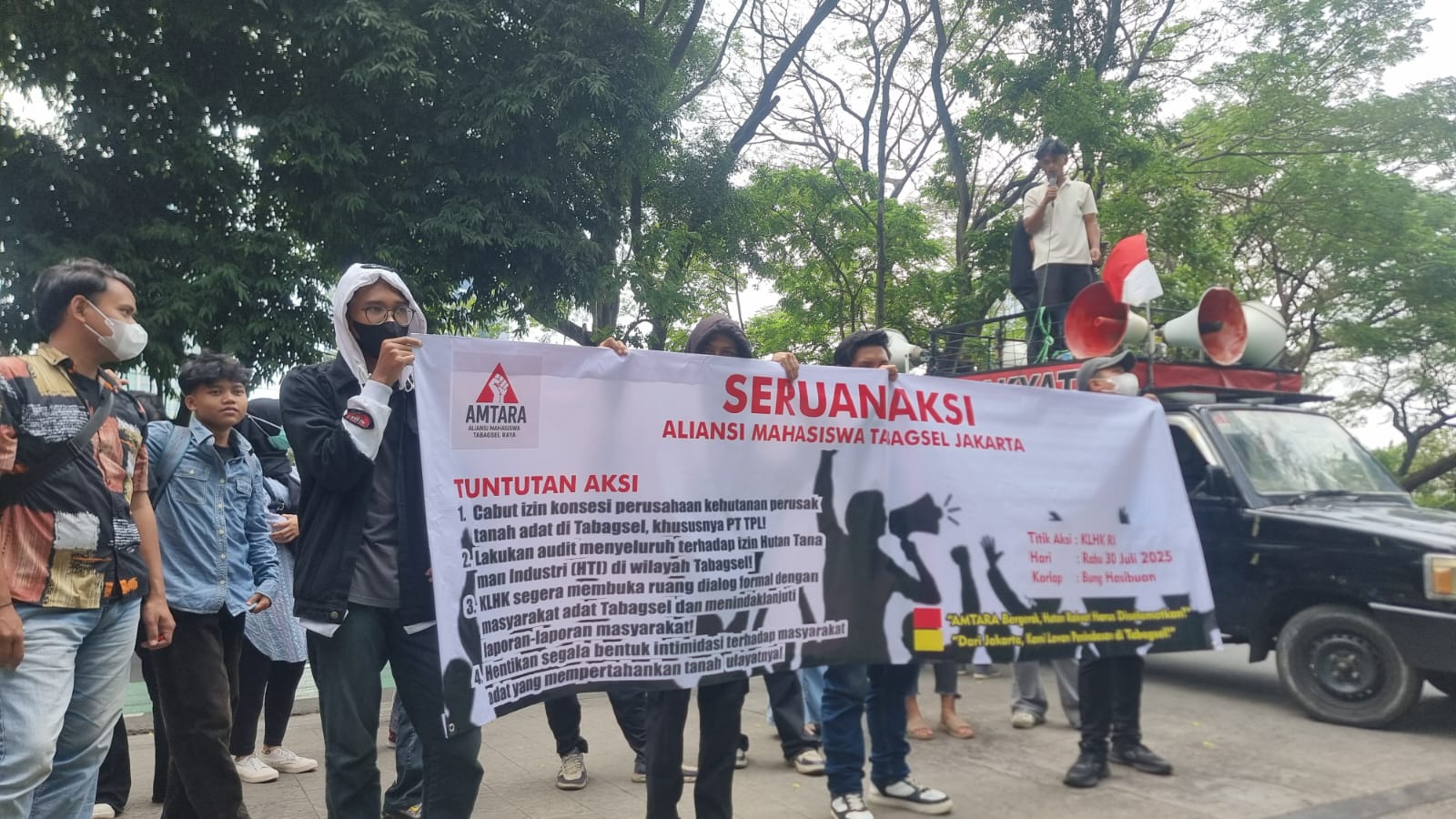 Rabu 30 Juli 2025,Ratusan mahasiswa yang tergabung dalam Aliansi Mahasiswa Tabagsel Raya (AMTARA) menggelar aksi damai di depan gedung Kementerian Lingkungan Hidup dan Kehutanan Republik Indonesia (KLHK RI), Rabu (30/7/2025). Aksi ini merupakan bentuk protes atas maraknya dugaan perampasan tanah adat dan kerusakan lingkungan hidup di wilayah Tapanuli Bagian Selatan (Tabagsel), Sumatera Utara.