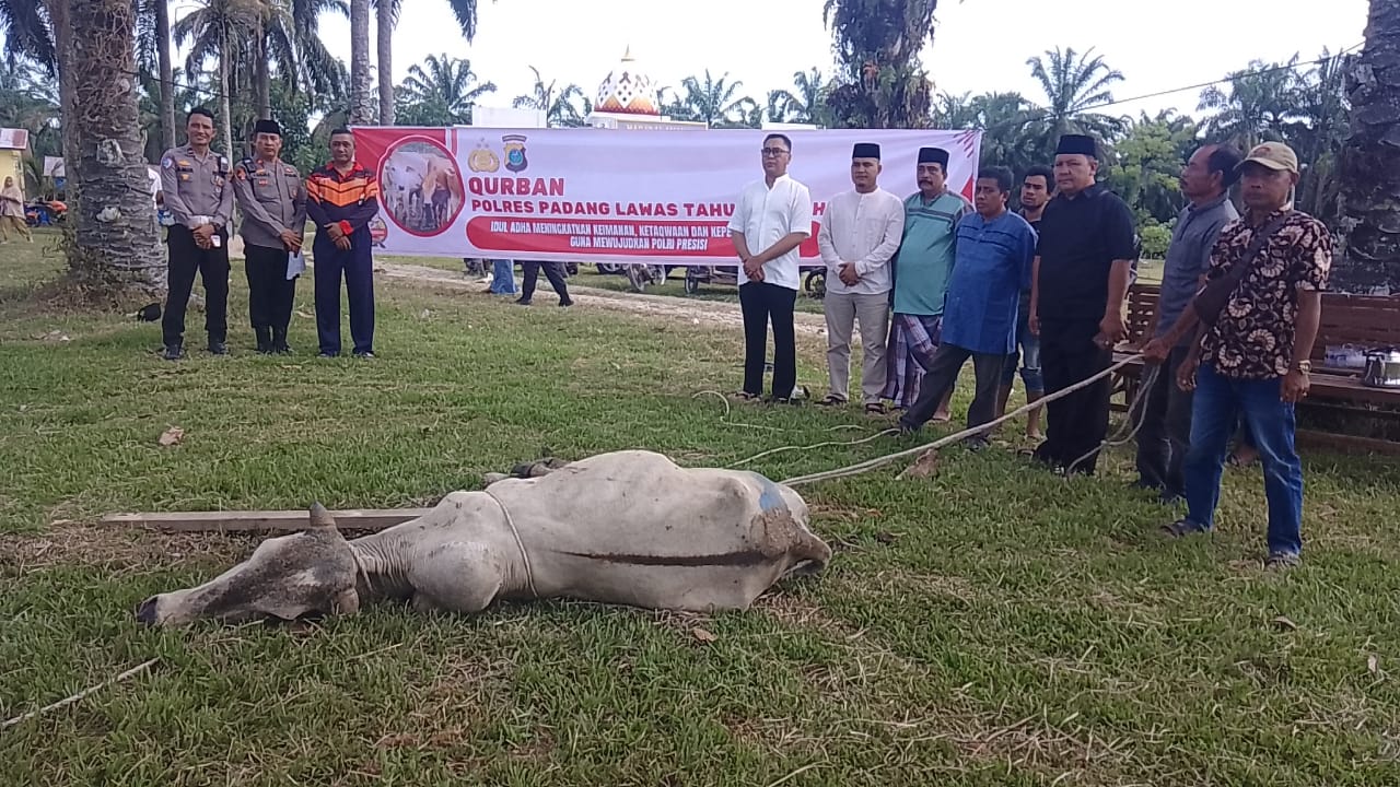Jum’at 6/ Juni 2025, polres Padang lawas ikut berkiprah di hari raya idul adha ini dengan menyembelih hewan kurban berupa lembu sebanyak empat ekor, salah satu di antaranya pemberian dari ayahanda bupati Padang lawas putra mahkota alam Hasibuan,SE, yaitu bapak haji Rajamin Hasibuan beliau membenarkan pemberian ini saat media ini menghubungi beliau melalui telpon seluler Jum’at 6/ Juni 2025 di kediamannya di kec Sosa Julu kabupaten Padang lawas