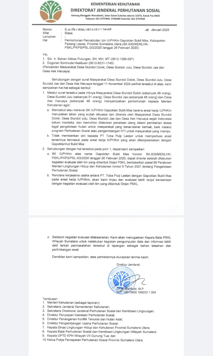 Sudah sangat jelas Kementerian Lingkungan Hidup dan kehutanan sudah mengeluarkan surat nomor: S. 539/PSKL/PKPS/PSL-0/12/2025 Tanggal 11 Desember 2023 yang ditujukan ke Kepala PSKL wilayah Sumatera Utara untuk melakukan evaluasi terhadap izin Gapoktan Bukit Mas nomor: SK. 830/MENLKH-PSKL/PKPS/PSL-0/2/2020 Tanggal 26 Februari 2020.