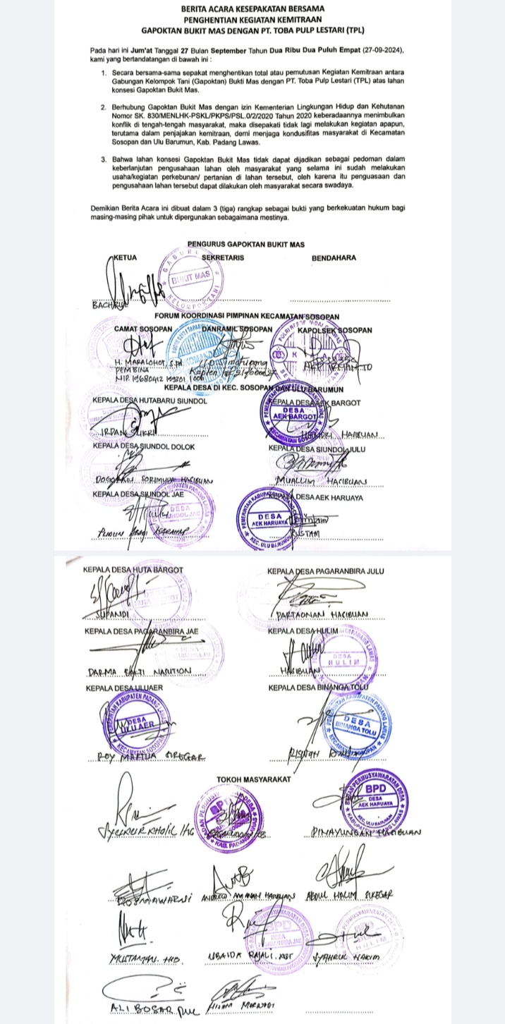 - Menolak kemitraan Gapoktan Bukit Mas dengan PT. Toba pulp Lestari ( TPL) dan hal ini sudah sejalan dengan kesepakatan bersama hari Jum’at 27 September 2024 yang lalu tentang penghentian Gapoktan Bukit Mas dengan PT. Toba pulp Lestari (TPL) atas izin yang diperoleh, sarat dengan masalah dalam prosesnya yang menimbulkan konflik di tengah-tengah masyarakat desa aek bargot, huta baru siundul, siundul dolok, siundul julu, siundul jae, aek hayuara, kecamatan Sosopan