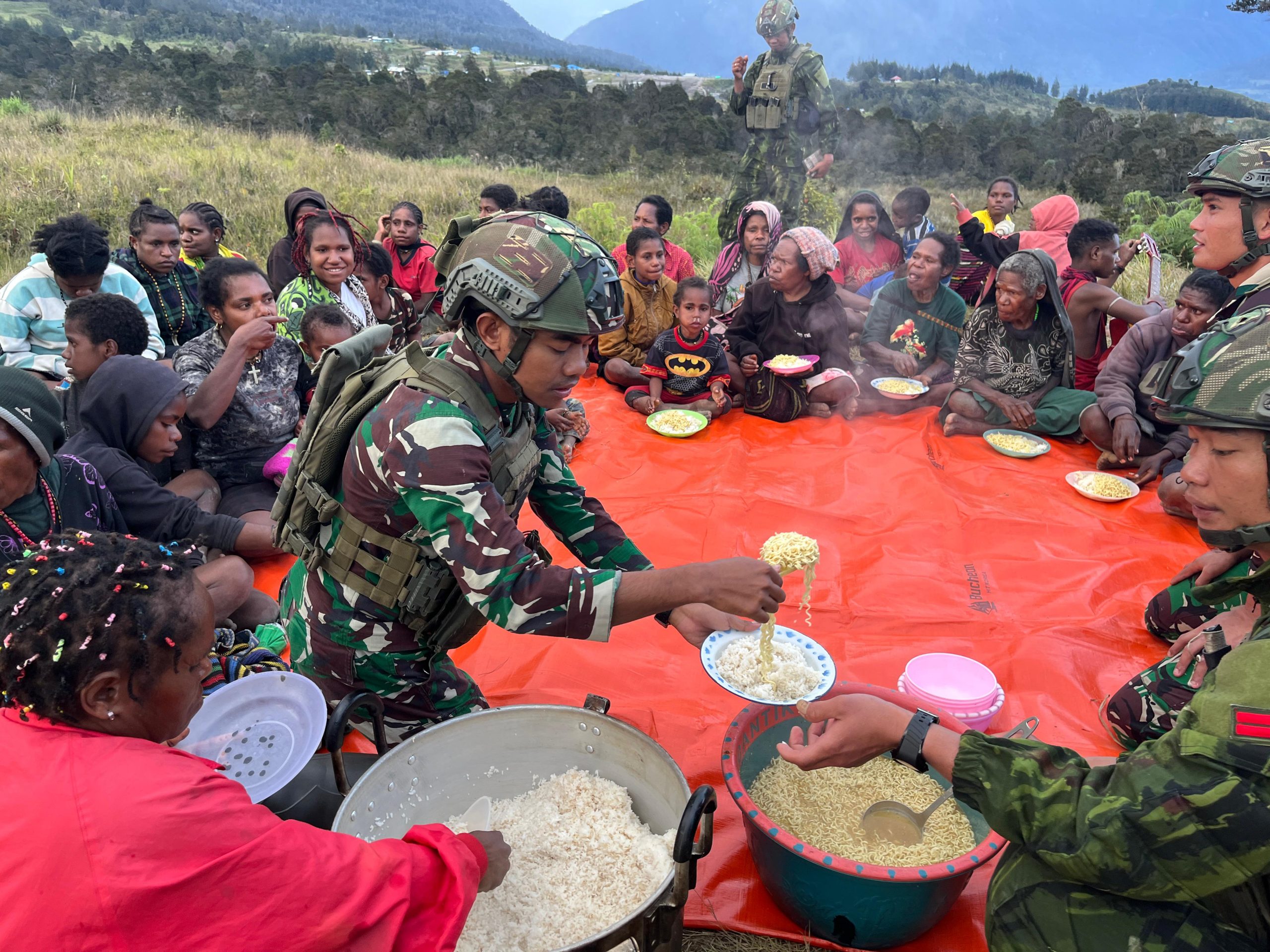 Dalam balutan kesederhanaan namun sarat kehangatan, para prajurit membawa bantuan makanan – nasi hangat dan indomie rebus – bukan sekadar untuk mengisi perut, tetapi untuk menyambung semangat. Di tengah gelapnya malam Papua, mereka duduk melingkar, menyantap kebersamaan yang sederhana namun penuh makna.